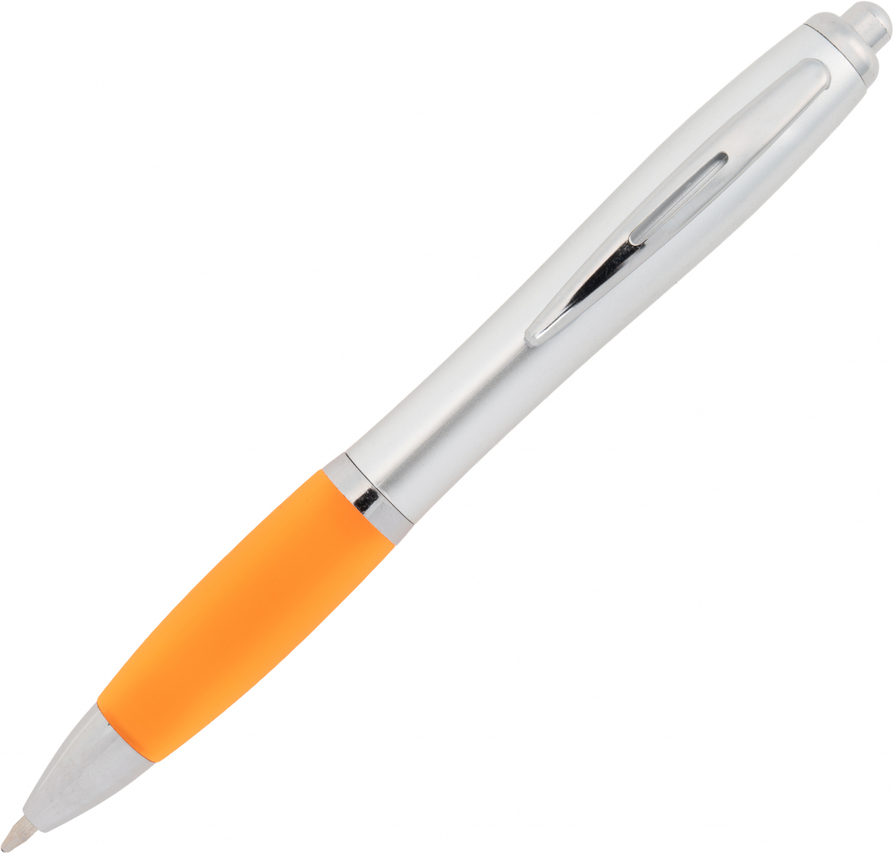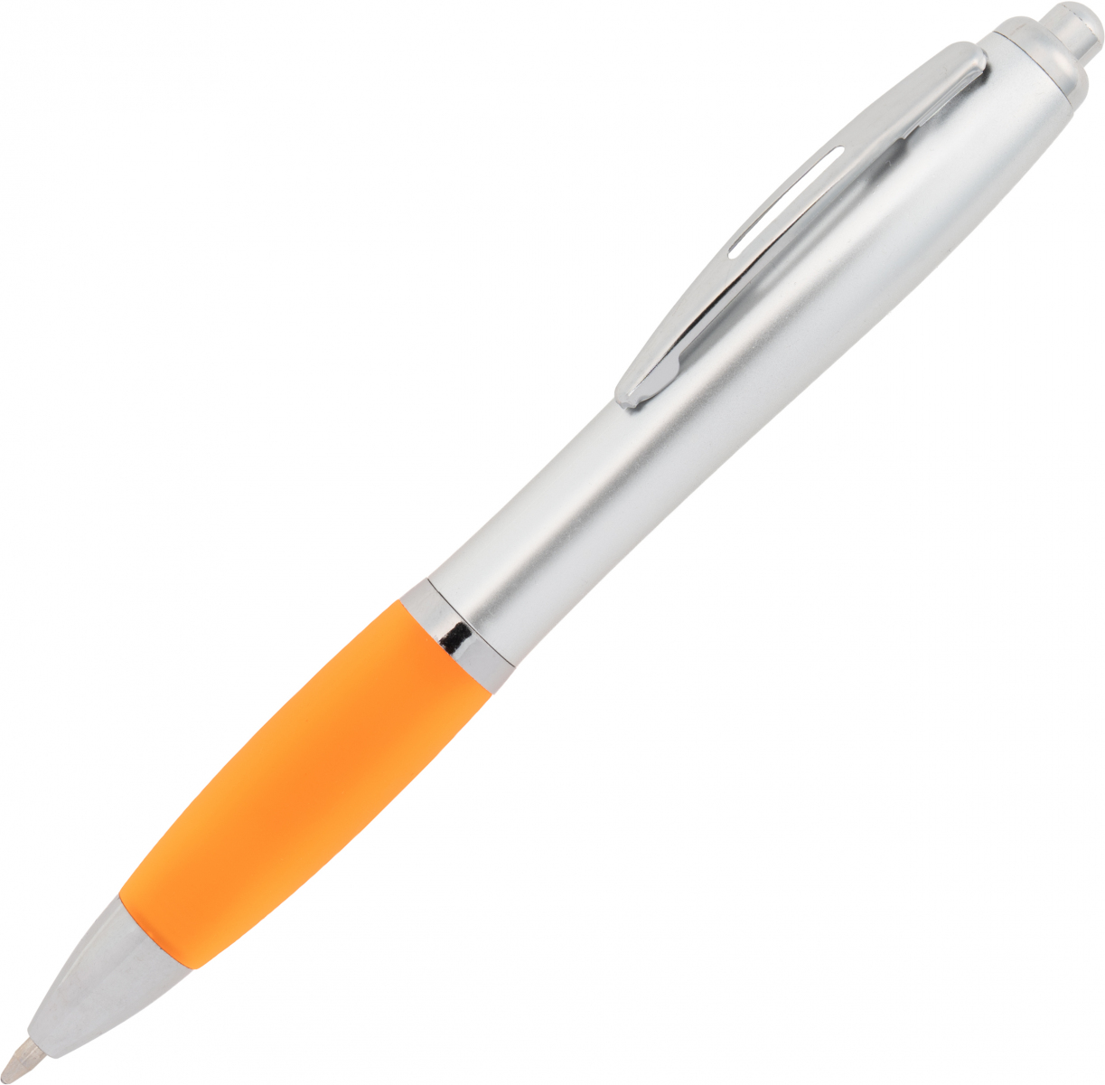 Plastikowy długopis z satynowym połyskiem, wyposażony w metalowy klip, gumkę ułatwiającą pisanie oraz duży, niebieski wkład. Nadruk reklamowy umieścimy na korpusie, z prawej strony klipu.