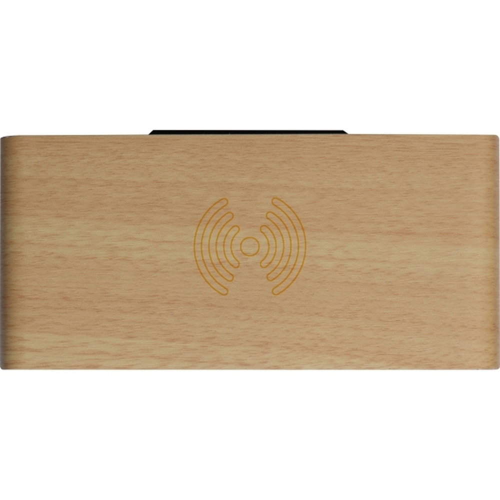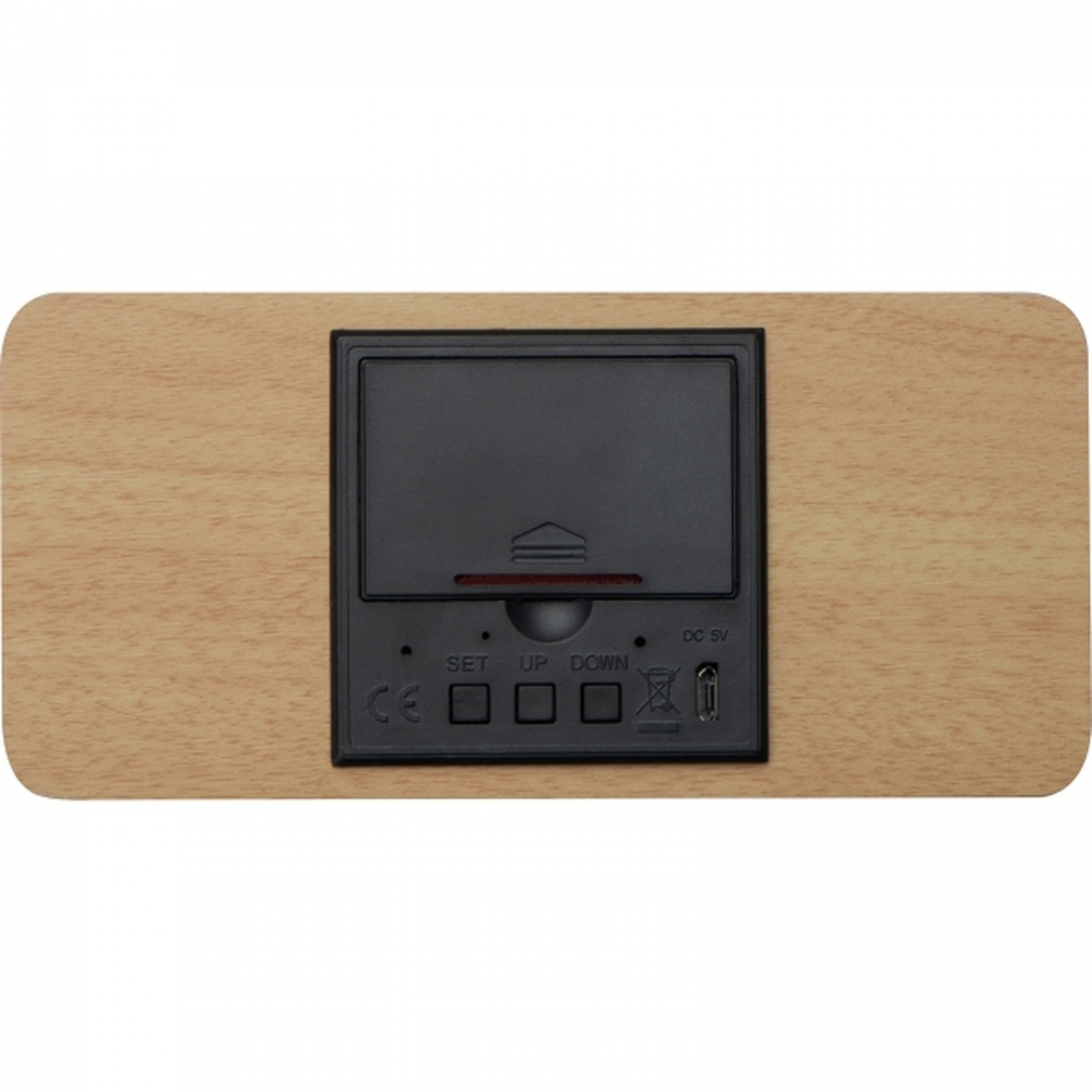 Zegar na biurko wykonany z drewna z termometrem i bezprzewodową ładowarką.